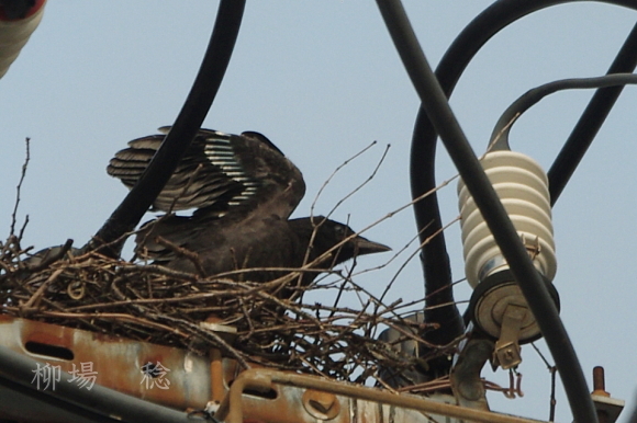 国道沿いの電柱の安定器の上にハシボソガラスが巣を掛けました。(